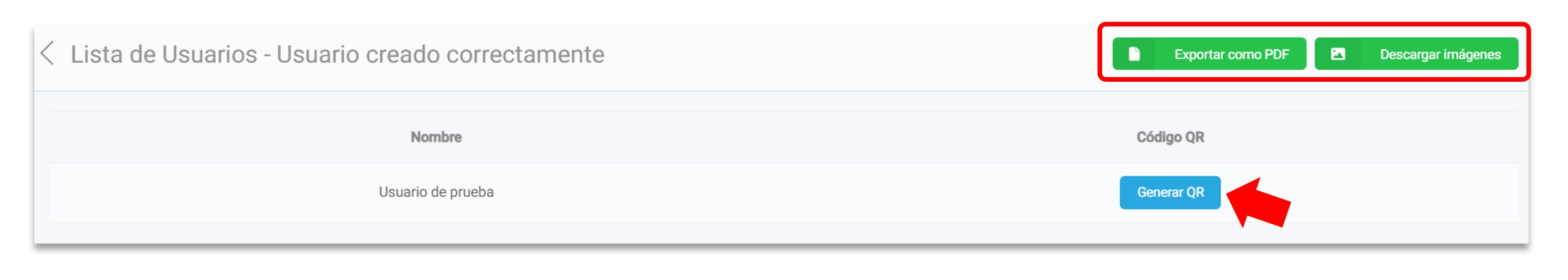 - Una vez creado el usuario te llevará a la lista de usuarios, donde podrás exportar el código QR como PDF o como imagen o generar el código QR con el botón "Generar QR".