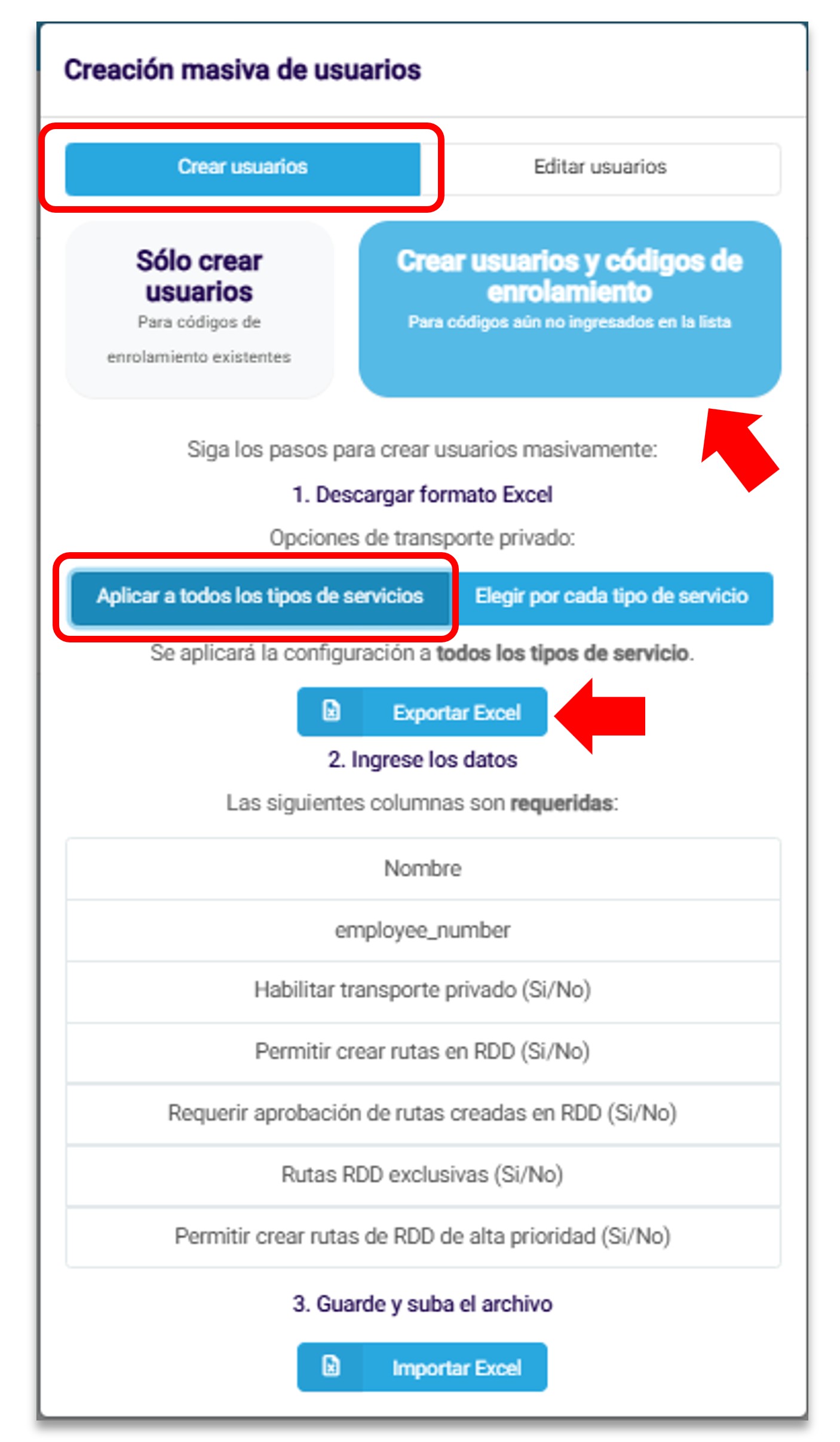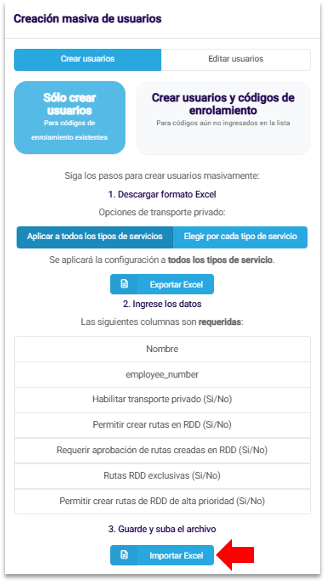 - Podrás crear usuarios de manera masiva con el botón "Creación/Edición masiva" para descargar un Excel de creación masiva.