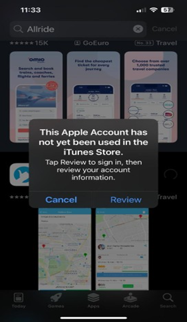 13. Al pinchar en “Obtener / Get” la App, te aparecerá un letrero que te dirá: “esa cuenta no está todavía usando en iTunes Store” pincha en “Revisar / Review”.