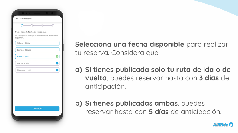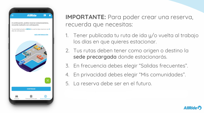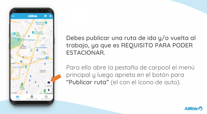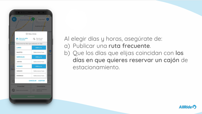 3. Publica tus rutas hacia y desde las sedes, seleccionado la sede en que quieres estacionar y los días en que vas a viajar.
